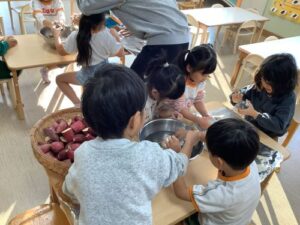 きらめき組のみんなでお芋の下準備をして、恐る恐る焚き火に投入しました🍠