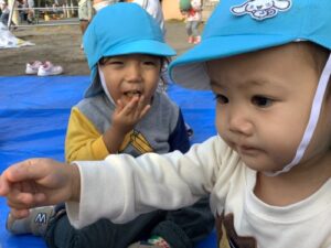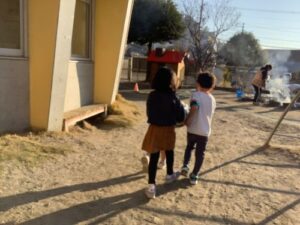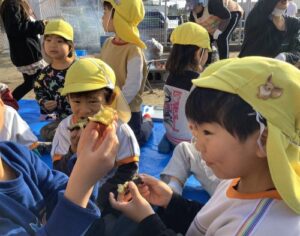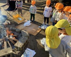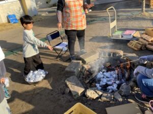 登園した子供たちが焼き芋の焚き火から煙が立ち込めている様子を見て「焼き芋だ!」「この匂いいいにおいがする!」と喜んでいました。