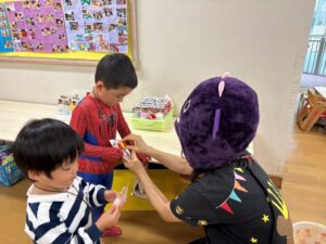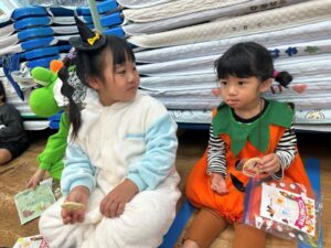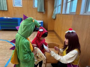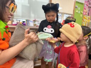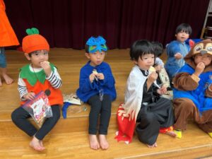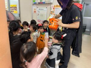 「トリック・オア・トリート!!」と言いながら仮装をした子どもたちがおやつをもらいにきてくれました(*^-^*)