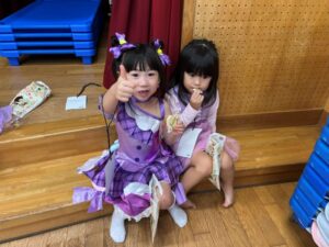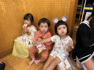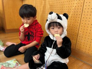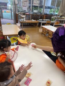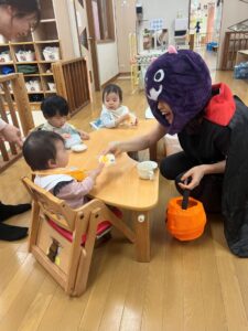01の子どもたちも、おやつをもらえると分かると着ぐるみを被った先生に手を伸ばし、怖がることなくおやつをもらっていました。