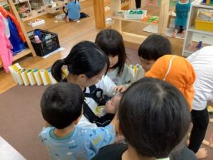 園児のお友達が話しかけると、始めは緊張した様子でしたがいつのまにか会話をしていて一緒に遊んでいました。