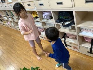 大きい組のお友達と電車遊びやままごと遊びをしているうちにあっという間に終わりの時間になり、仲良くなったお友達と別れを惜しんでいました。
