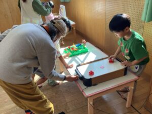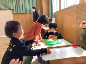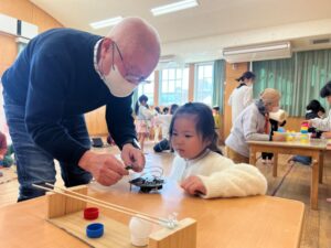 今日の子育て支援では小原町の町内会長さんにいろいろな遊びを持ってきてもらいました。